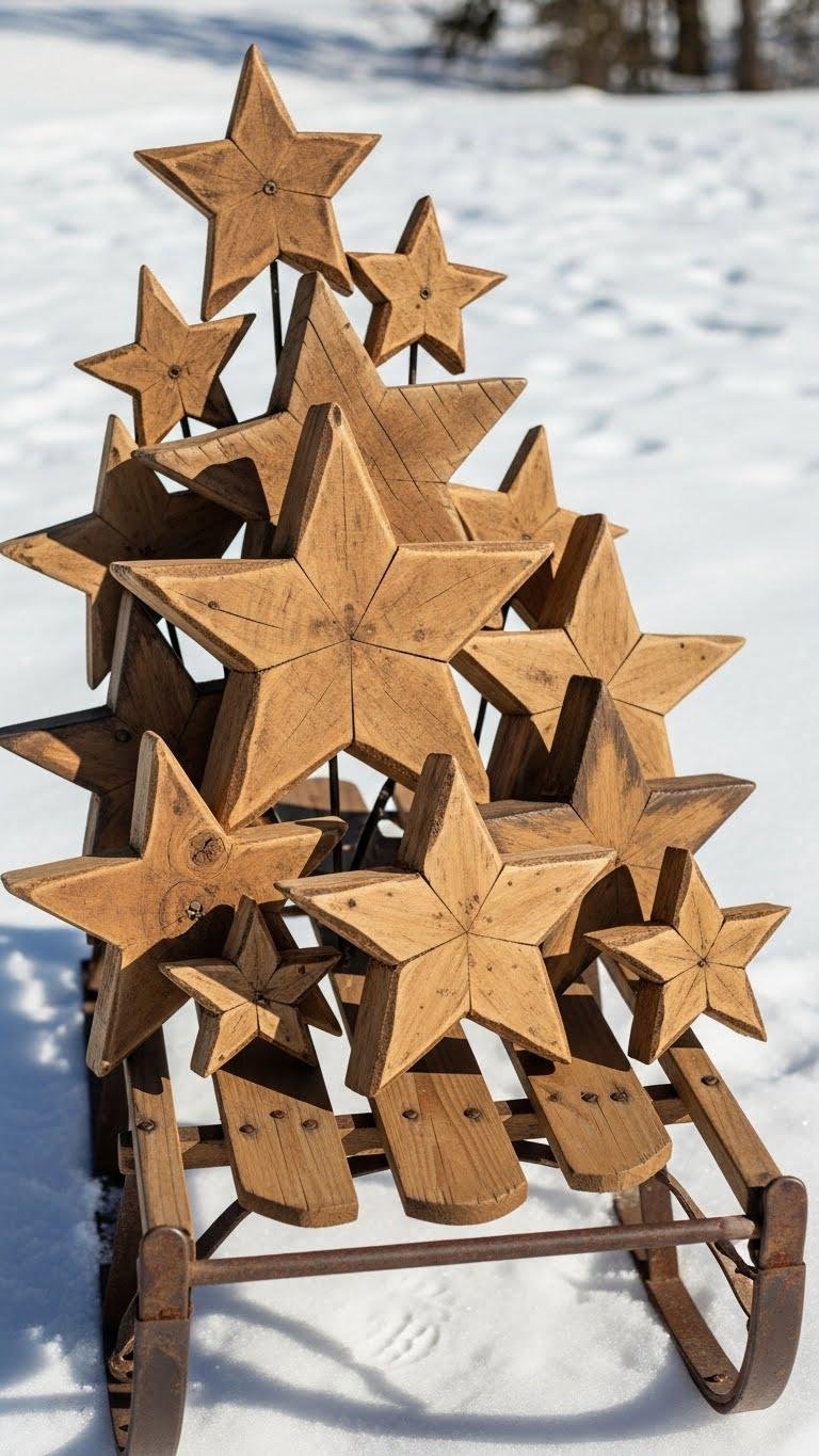 Kick things off by grouping a few rough-cut wooden stars of different sizes so you can see how they’ll sit on the sled; this cluster gives a warm, handmade focal point that complements painted or stained wood. Secure weatherproof stars with outdoor adhesive or screws, mix reclaimed finishes for contrast, and position the cluster where it won’t catch snow—simple, bold, and free-spirited.