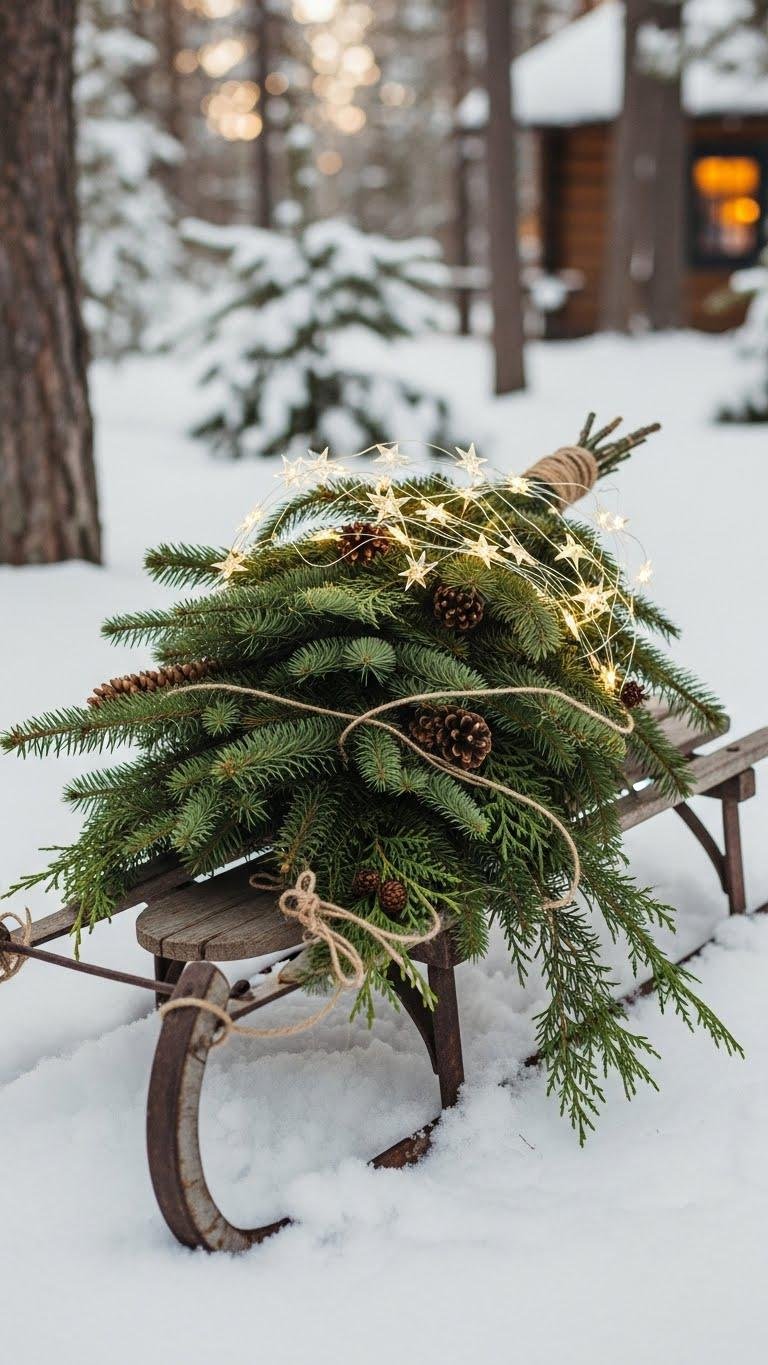 Keep the jingling bells but add a little greenery: load a pair of mini evergreen trees onto the sled to create instant winter charm. You’ll secure a miniature spruce and tiny fir centerpiece with twine or bungee cords, tuck snow dusted greens around bases, and angle them for balance.