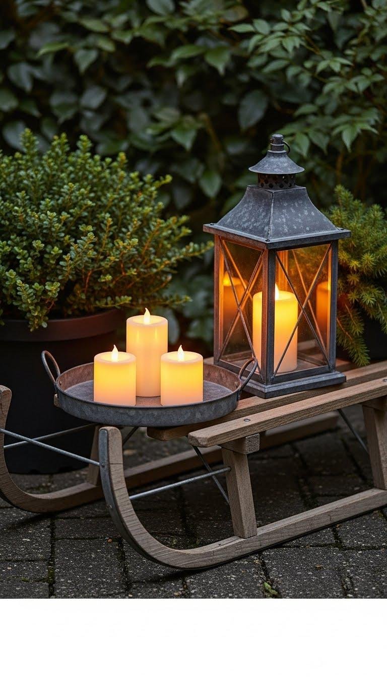 Place a lantern and candle tray near the sled to add warm, flickering light that invites folks in and highlights your greenery. You’ll choose lantern placement for stability and wind protection, set candles on a metal tray to contain drips, and secure everything against gusts. Practice candle safety: use LED alternatives if unattended, keep flammables away, and fasten decor so it won’t blow free.