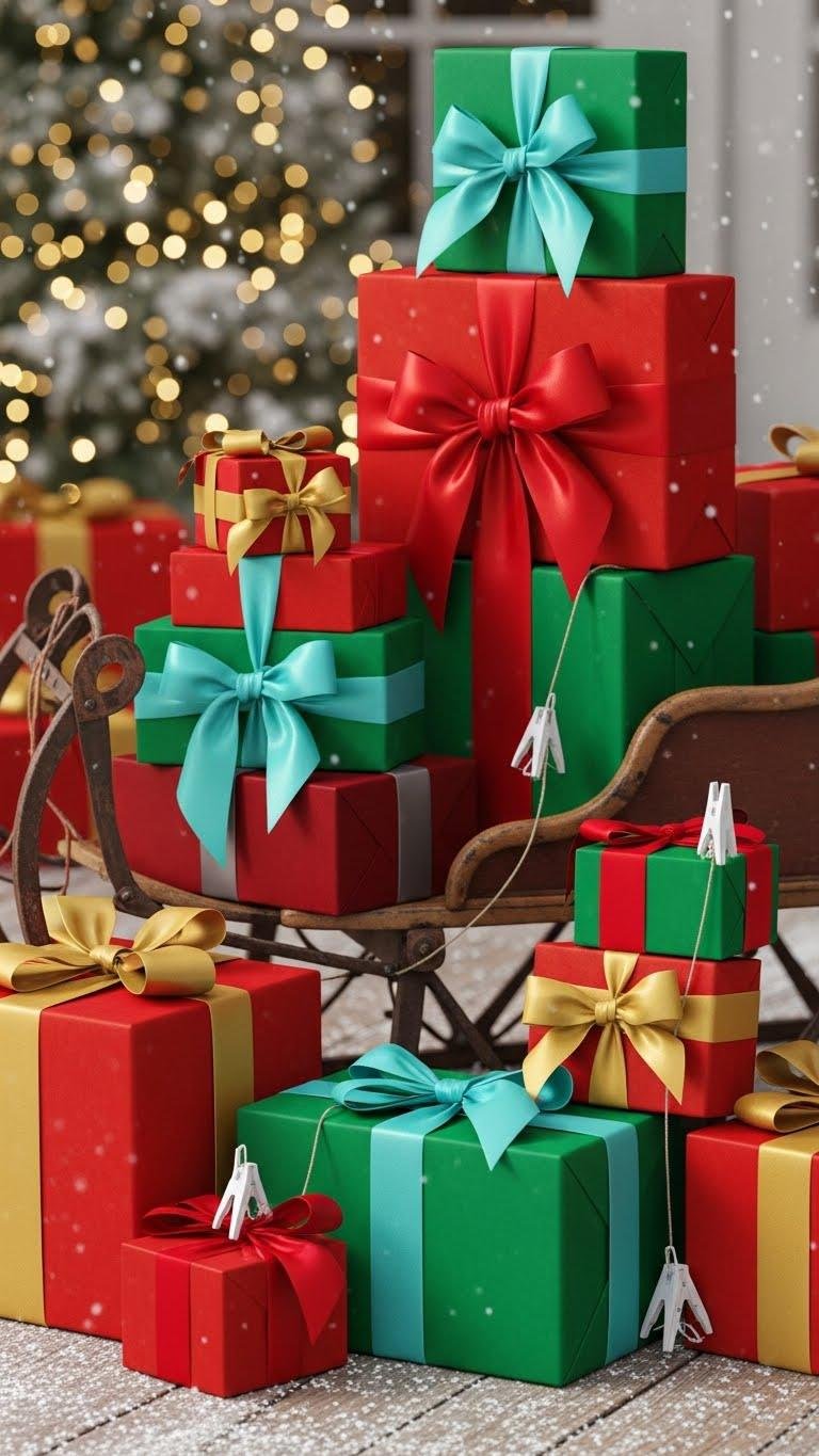 Wrap a few festive gift boxes to stack beside the sled and instantly boost its holiday charm. Choose sturdy boxes, pick bold gift wrap, and secure lids with double-sided tape. Mix sizes for a casual, free-spirited look. Finish each with satin bows tied tight so they survive wind. Anchor packages with lightweight twine or removable clips to keep them in place.