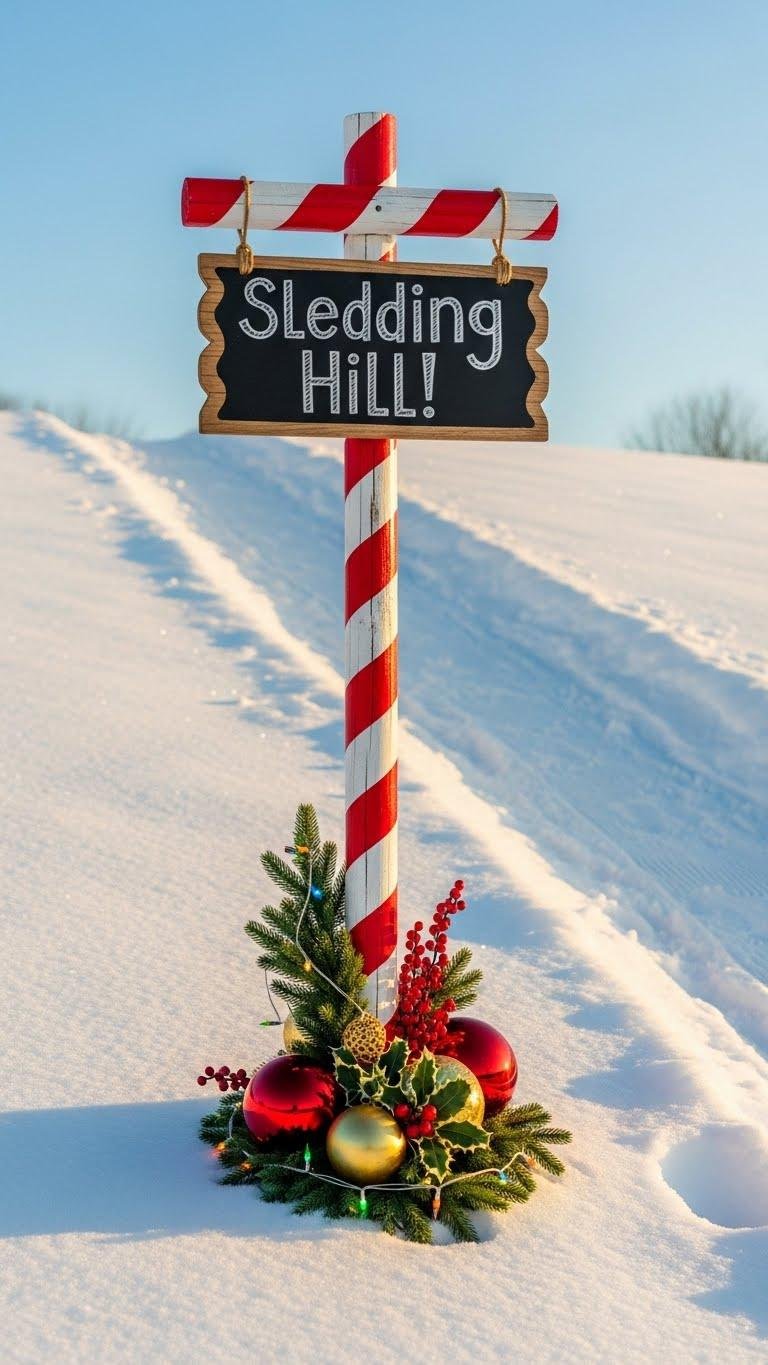 If you want your sled display to feel festive and guide the way on the hill, build a candy cane pole and signpost that’s sturdy, weatherproof, and easy to spot. Paint a wooden post as a striped pole, seal with outdoor varnish, and mount a chalk sign for directions or messages. Anchor firmly in snow and you’re ready to roll.