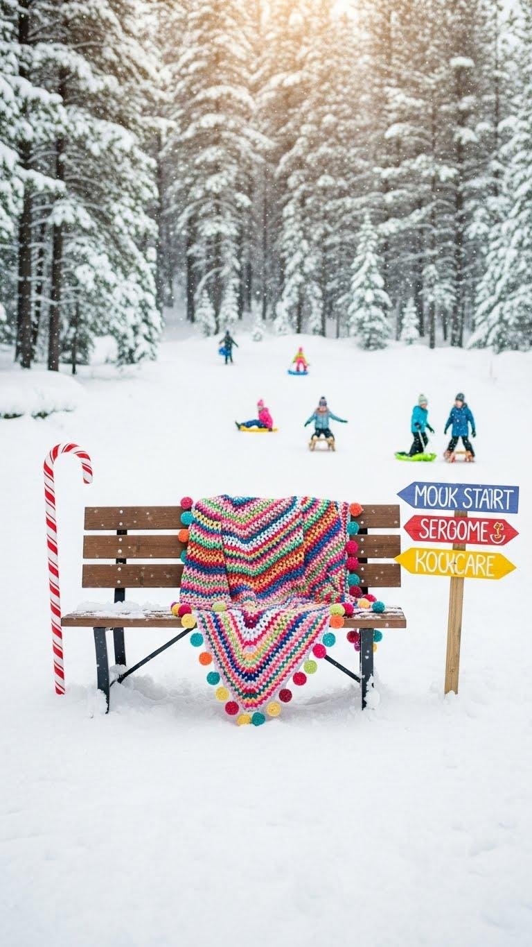 After you’ve planted your candy cane pole and hung a friendly sign, bring comfort to the sledding spot with a cozy knit blanket topped with playful pom-poms.