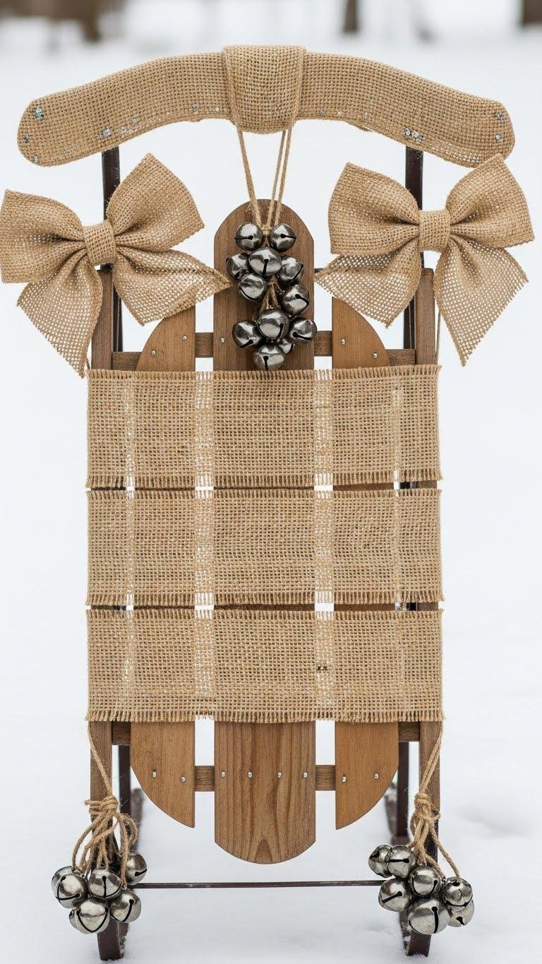 For a rustic, jingling finish, wrap a wide burlap ribbon around the sled’s rails and secure it with hot glue or small staples.
