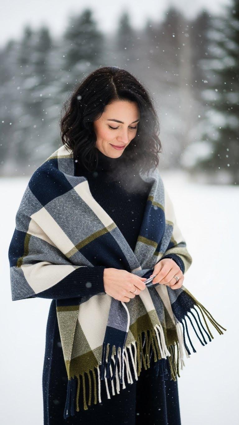 A striped wool wrap with tassels adds instant polish to any winter outfit, and you’ll find it’s as practical as it’s pretty. You’ll drape it over shoulders, secure with a simple knot, and enjoy warmth without weight.