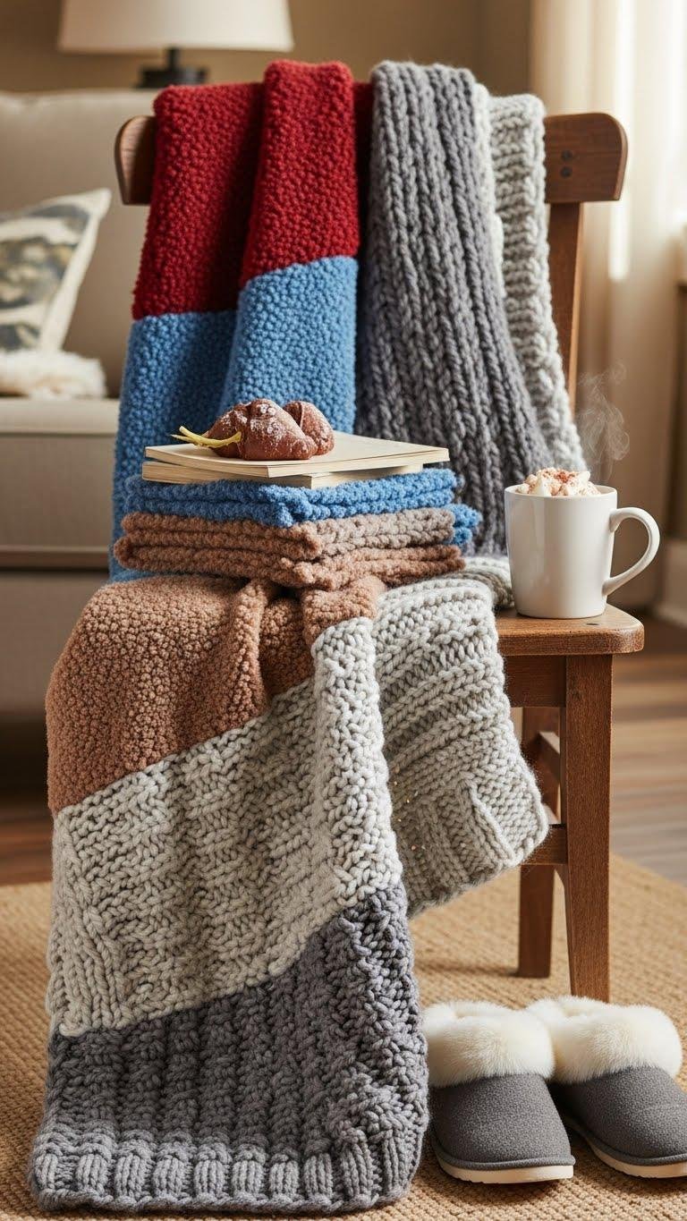 For a layered, tactile look that still feels cozy, pair plush felt panels with chunky knit sections to make a mixed-media throw you’ll reach for again and again.