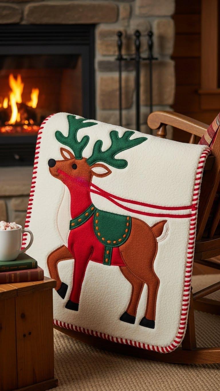 Bring a little rustic charm to your fleece-lined lap rug with a felt appliqué reindeer motif that’s simple to cut, stitch, and personalize.