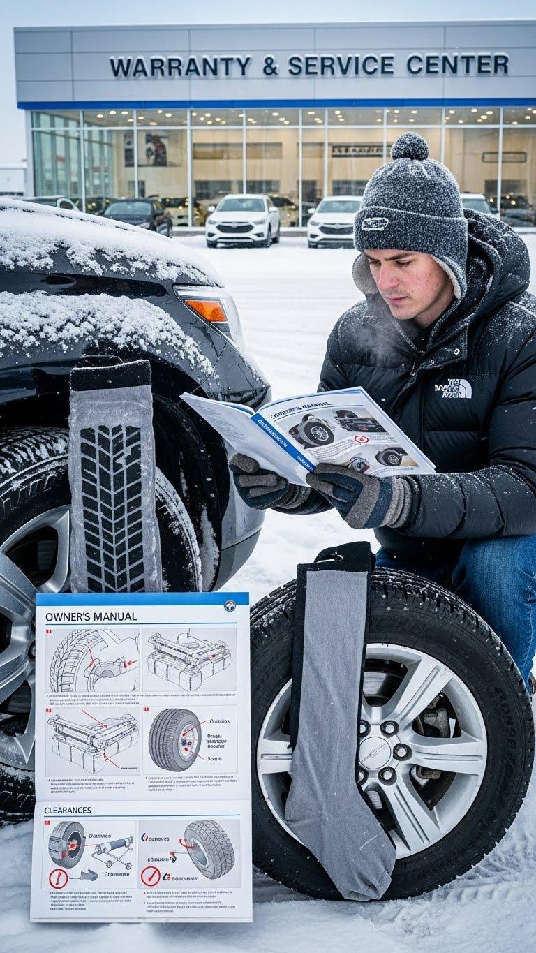 After you’ve timed and practiced fittings on dry ground, confirm that your vehicle manufacturer allows temporary traction devices like snow socks and note any limits they set.