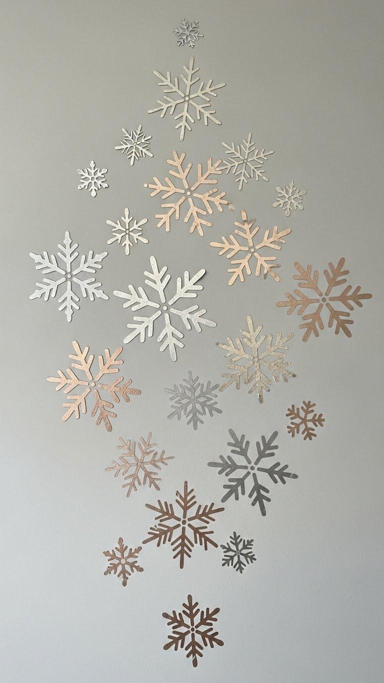 Because varying snowflake sizes creates visual rhythm, start by mapping a loose grid on your wall to guide placement and avoid crowding—and don’t be afraid to break the grid for interest.