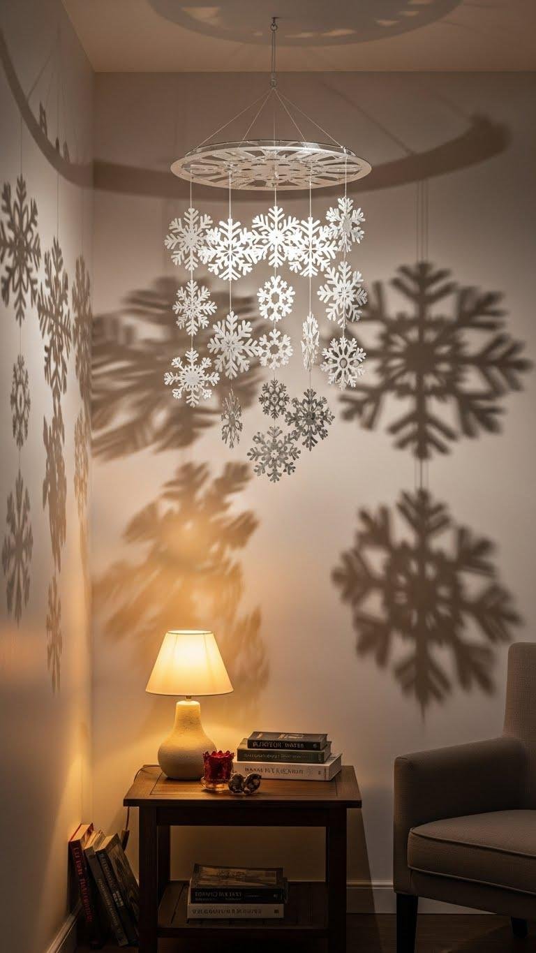 After your stenciled cluster settles into the room, add movement with a hanging spinning snowflake mobile that catches light and subtly shifts the vignette. You’ll craft a lightweight kinetic installation, balancing cutouts on thin wire for effortless rotation. Suspend it as a refined ceiling display above a reading nook or entryway. Let it twirl freely, casting delicate shadows that feel liberating and deliberate.