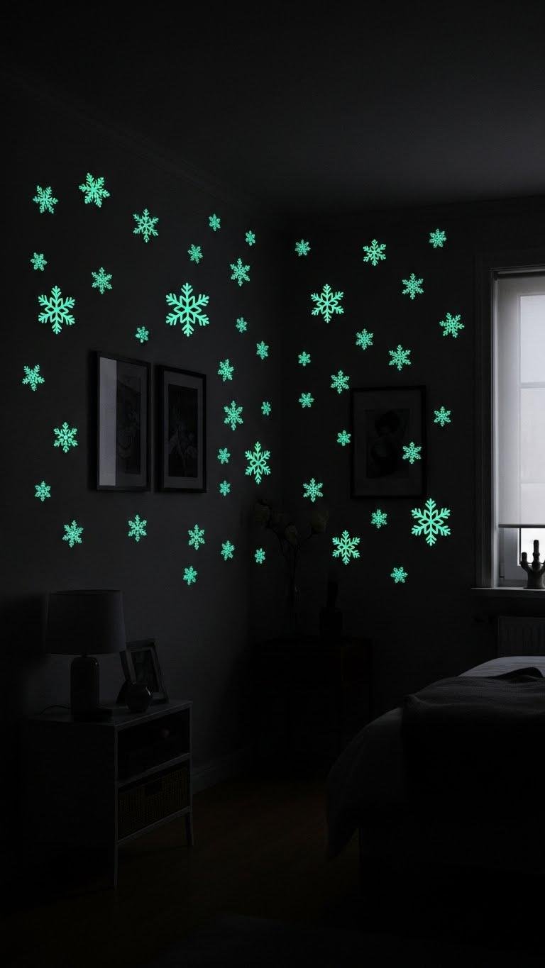 Switch on a low light and watch your walls turn whimsical: glow-in-the-dark snowflake stickers give rooms a soft, starry afterglow without wiring or fuss. You’ll place phosphorescent craft decals strategically, creating effortless nighttime ambiance. They recharge in daylight, cling cleanly, and peel off without residue.