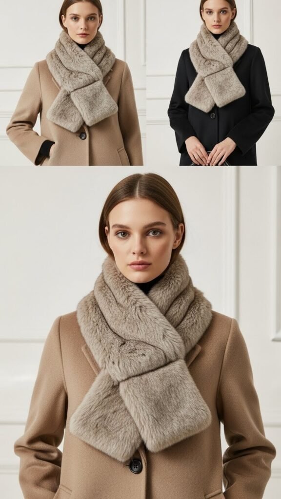 Drape a wide shawl-style faux fur collar over your shoulders and instantly soften a structured coat or elevate a simple sweater—its generous sweep frames your neckline and adds cozy drama without bulk.