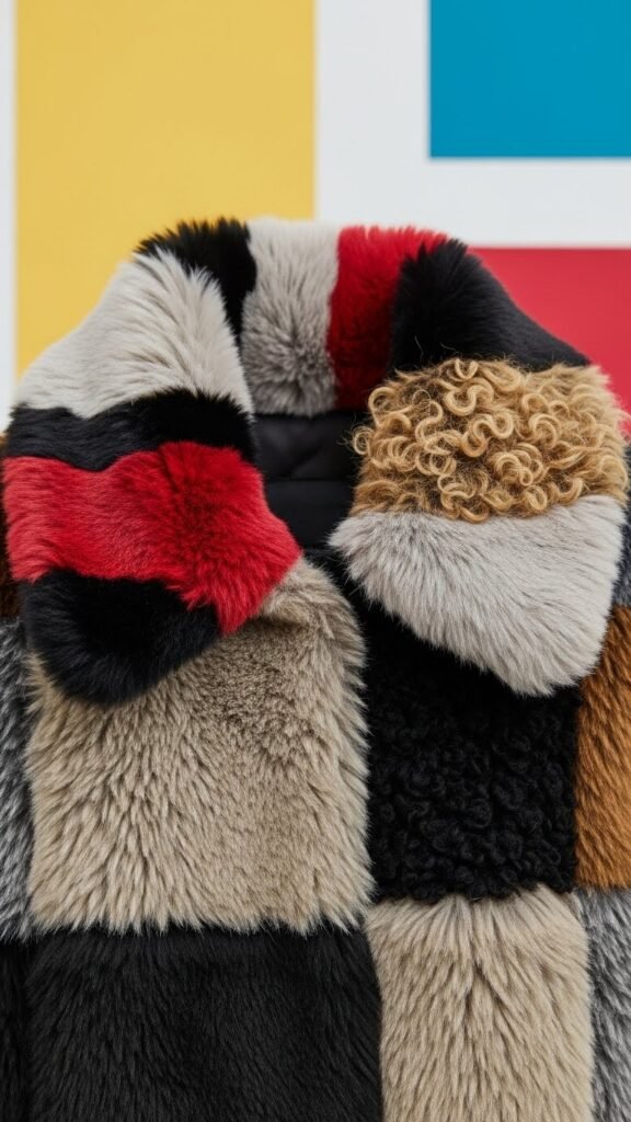 Mix and match textures to give a jacket instant character: a patchwork faux fur collar stitches together plush, curly, and short-pile panels so each seam reads like a deliberate design choice.