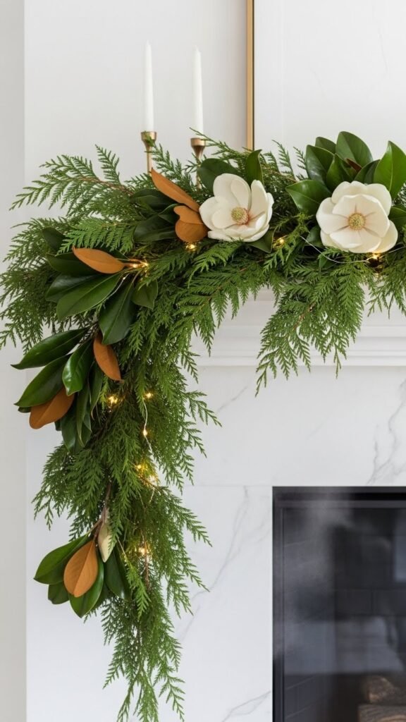 If you loved the classic pine look, try swapping in cedar for a sleeker, resinous base and tuck magnolia leaves and blooms among the boughs for contrast. You’ll drape it casually across mantel hooks, letting stems arc naturally.