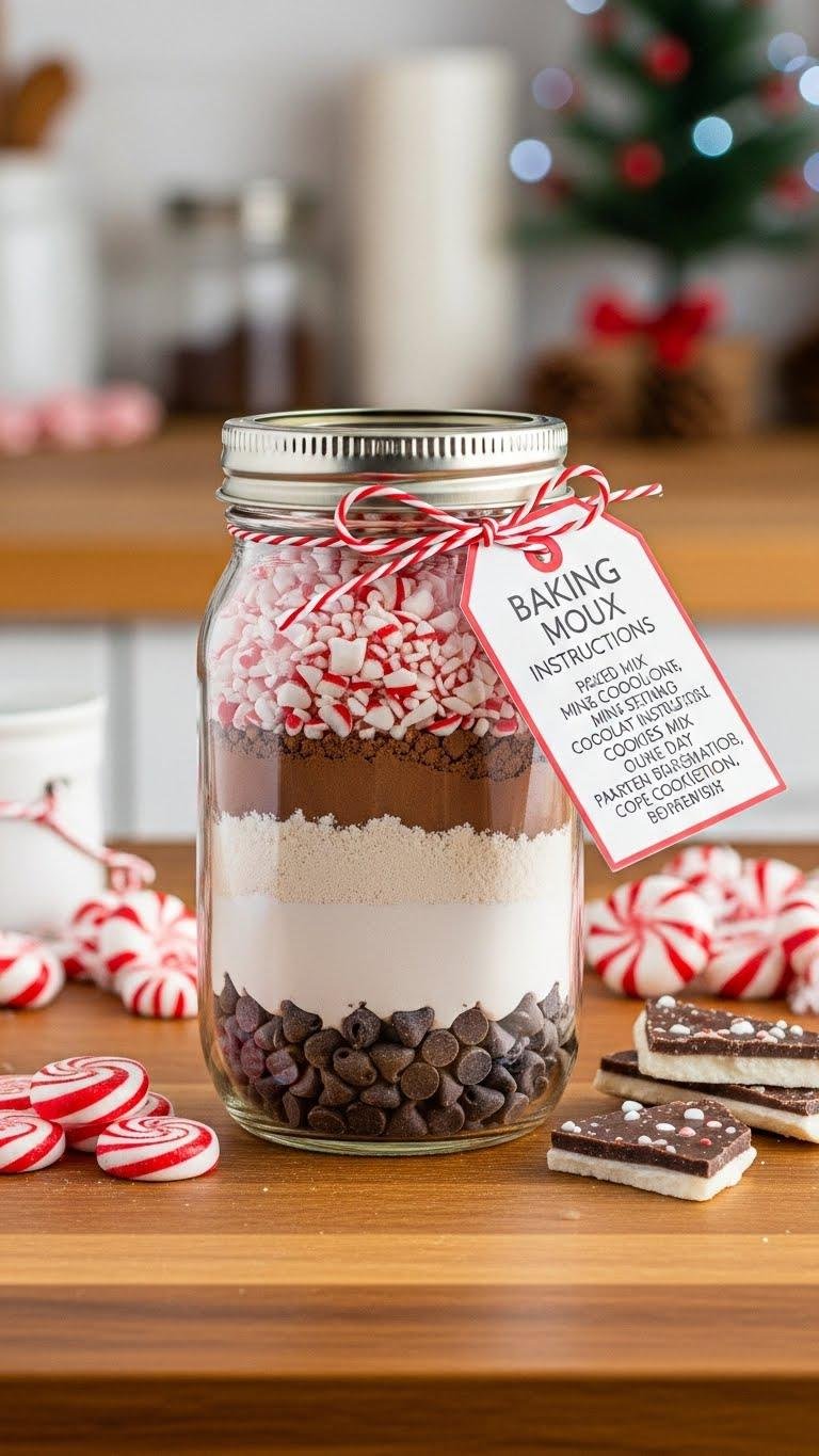 Layer crushed candy canes, cocoa powder, flour, sugar, and mini chocolate chips in a mason jar to create a Peppermint Chocolate Cookies mix that smells like a holiday kitchen before it’s even baked. Tie a tag with baking instructions, suggest a mint garnish or a shard of peppermint bark for topping, and let the recipient bake freely, savoring crisp edges and cool mint notes.