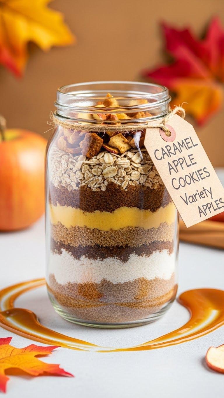 If you loved the chocolate-toffee jar, try a caramel apple cookie mix jar for a bright, autumnal twist that still layers beautifully in glass. You’ll scent cinnamon and brown sugar, include dried apple bits and oat flakes, and note Apple variety pairing on the tag. Add simple Caramel drizzle techniques for finishing, plus baking instructions so recipients can feel free to bake, share, and savor.