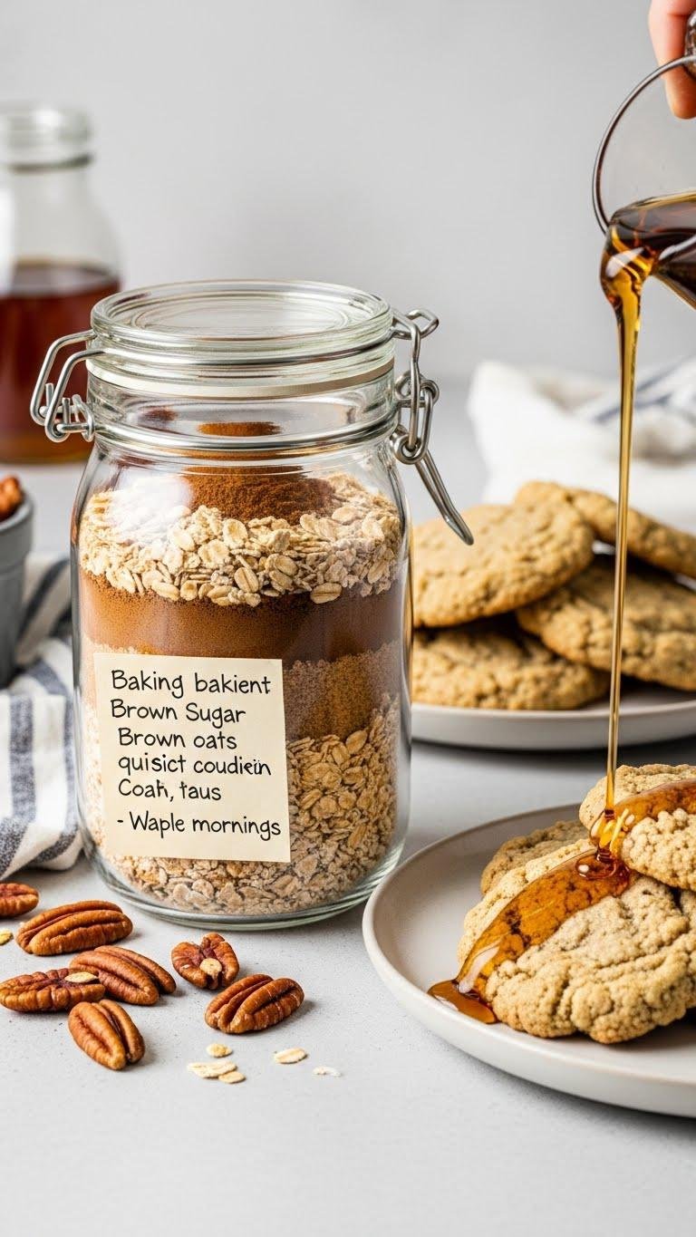 You’ll find layered dry ingredients, chopped pecans, and maple sugar—simple instructions let you bake fresh cookies fast. It’s perfect for maple breakfast lovers or thoughtful pecan gifting, offering freedom to share homemade comfort.