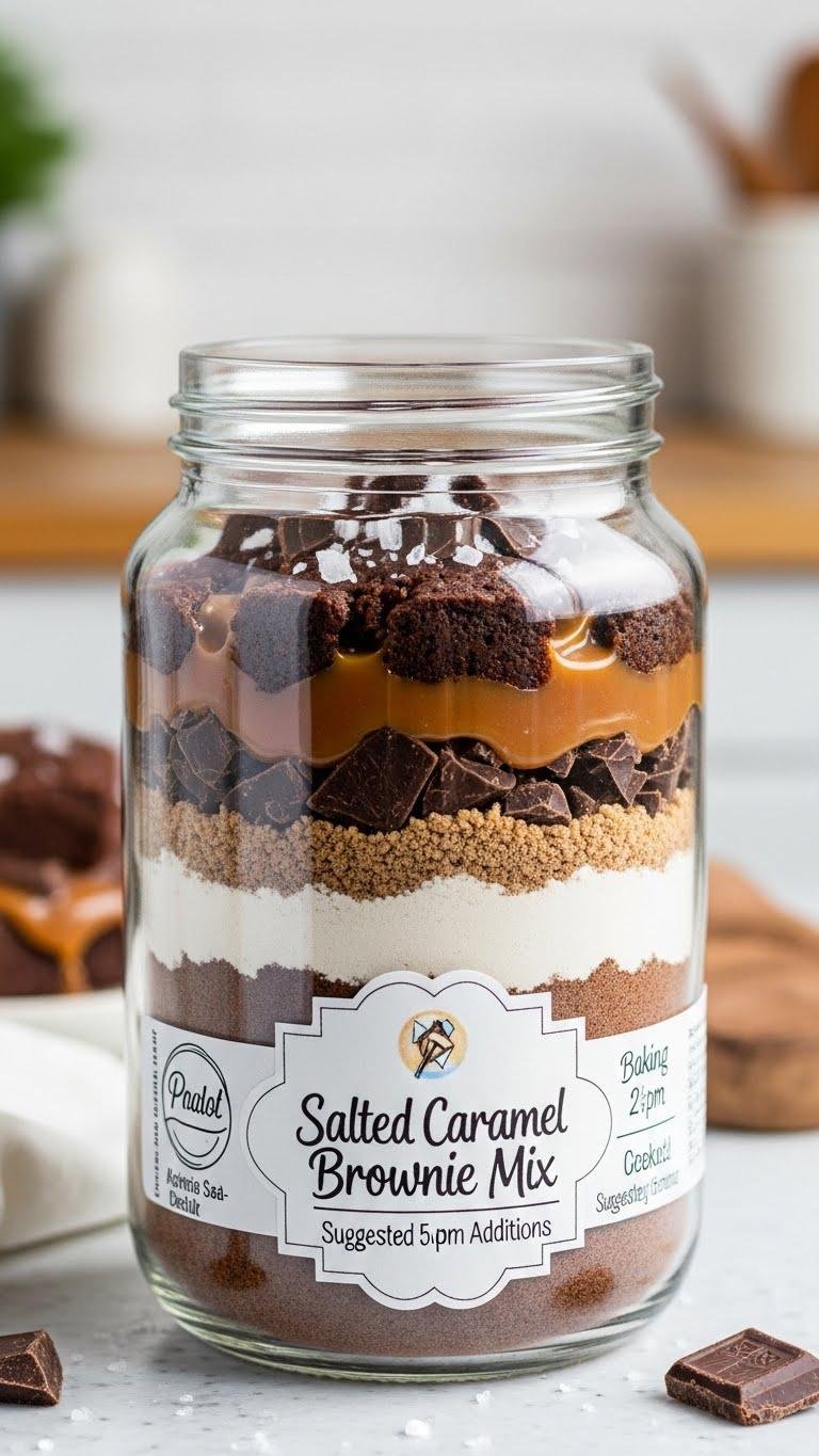 Pack layers of rich cocoa, brown sugar, flour, and chopped chocolate into a jar, tuck in pockets of chewy caramel and a sprinkle of flaky sea salt, and you’ve got a Salted Caramel Brownie Mix that tastes like a gourmet treat made simple.
