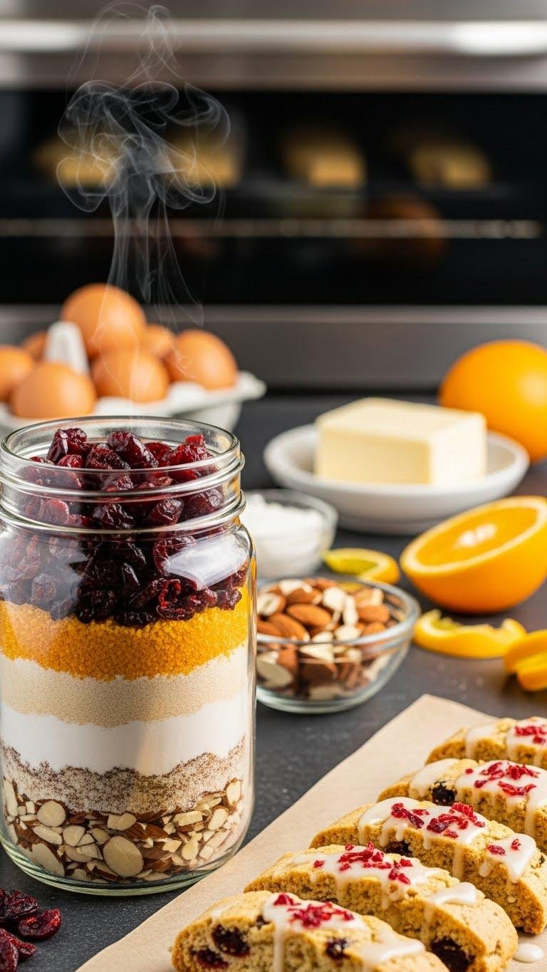 Layer tart dried cranberries, bright orange zest-scented sugar, almond flour, and crunchy slivered almonds in a jar so each scoop releases citrusy perfume and a pop of texture. You’ll add a note: mix with eggs and butter, shape, bake, and twice-toast for crisp biscotti.