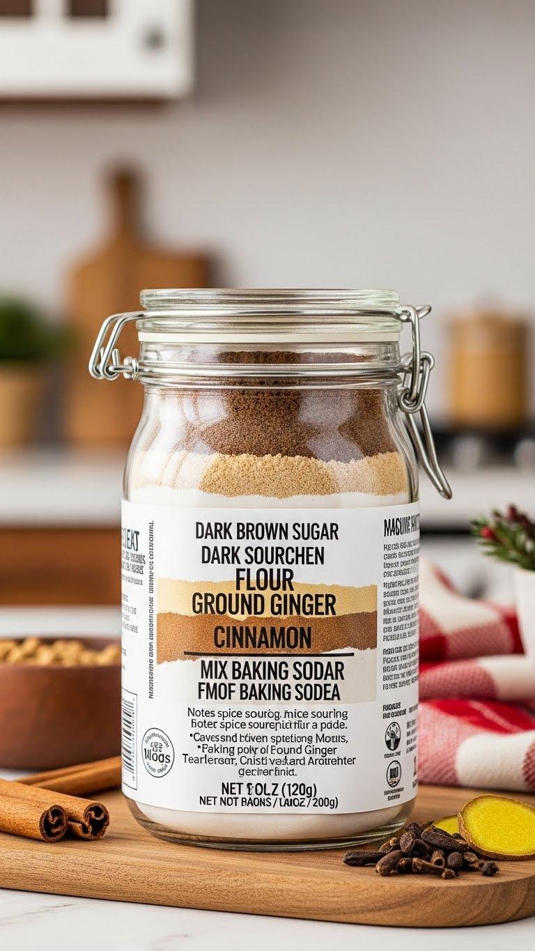 [IMAGE PROMPT: A beautifully layered jar filled with gingerbread cookie mix, showcasing the vibrant colors of brown sugar, spices, and flour. The jar is adorned with a festive ribbon and accompanied by decorative cookie cutters. A handwritten note detailing the addition of spiced molasses and an egg is attached to the jar, evoking a warm and cozy holiday atmosphere.]