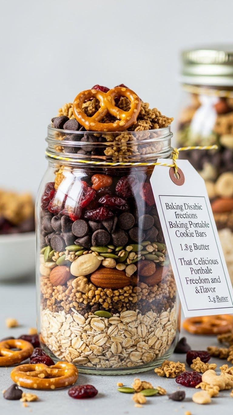 Often the jar catches you first with a spill of sweet and salty colors—golden oats, shadowy chocolate chips, ruby dried cranberries, and glossy nuts layered like a miniature trail.