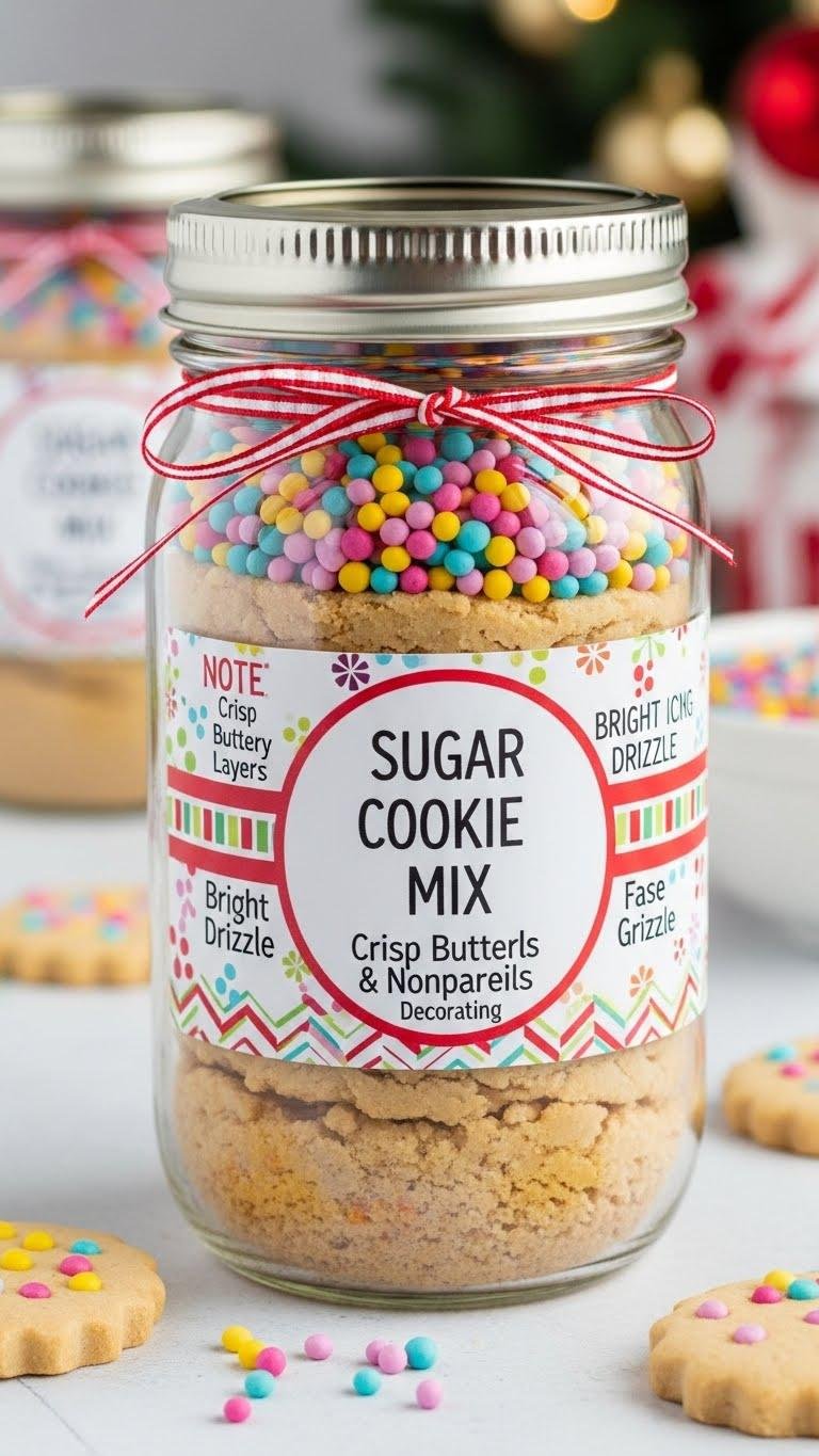 Often the simplest gifts feel the most festive, and a sugar cookie mix jar with a sprinkle topping gives you exactly that: a crisp, buttery dough base in a mason jar topped with a colorful band of nonpareils so the recipient sees the fun before they bake.