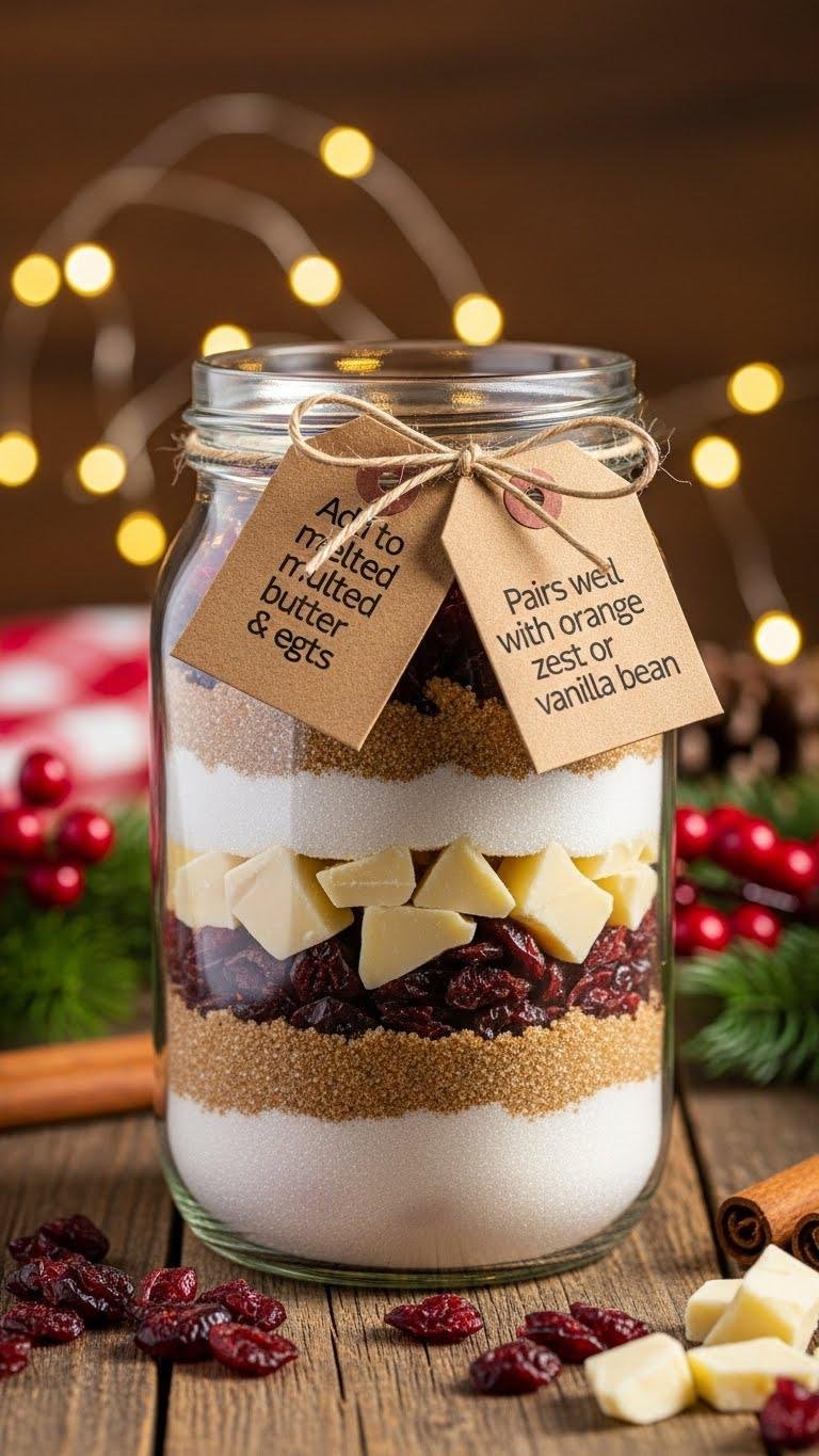 If you loved the warm spices of the gingerbread mix, try a jar that awakens bright, tart notes instead: white chocolate cranberry cookie mix layers gleaming sugar, dried cranberries, and pockets of white chocolate for a cheery contrast.