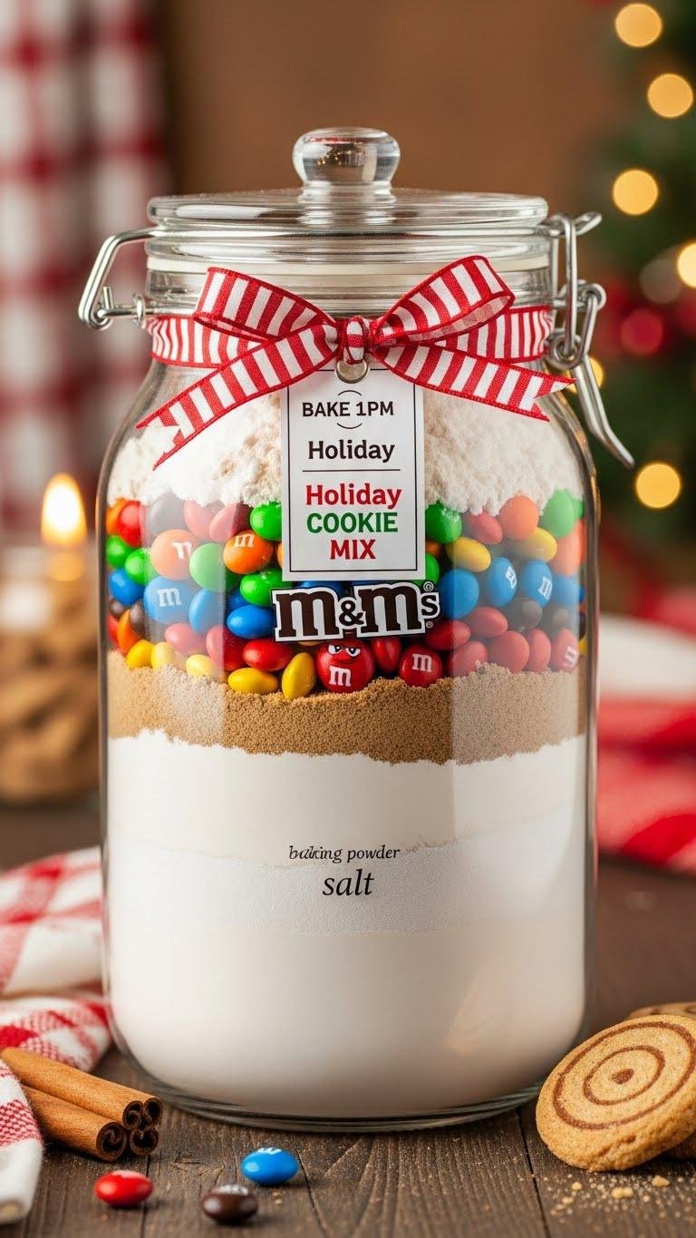 After enjoying the cozy cinnamon notes of snickerdoodles, you’ll love how an M&M Holiday Cookie Mix Jar adds a bright, cheerful twist to your gift lineup. You’ll layer flour, sugar, baking powder, salt, and colorful M&M variations for texture and pops of color. Include simple packaging tips: airtight lid, clear label with bake time, and a festive ribbon so recipients can bake freely.