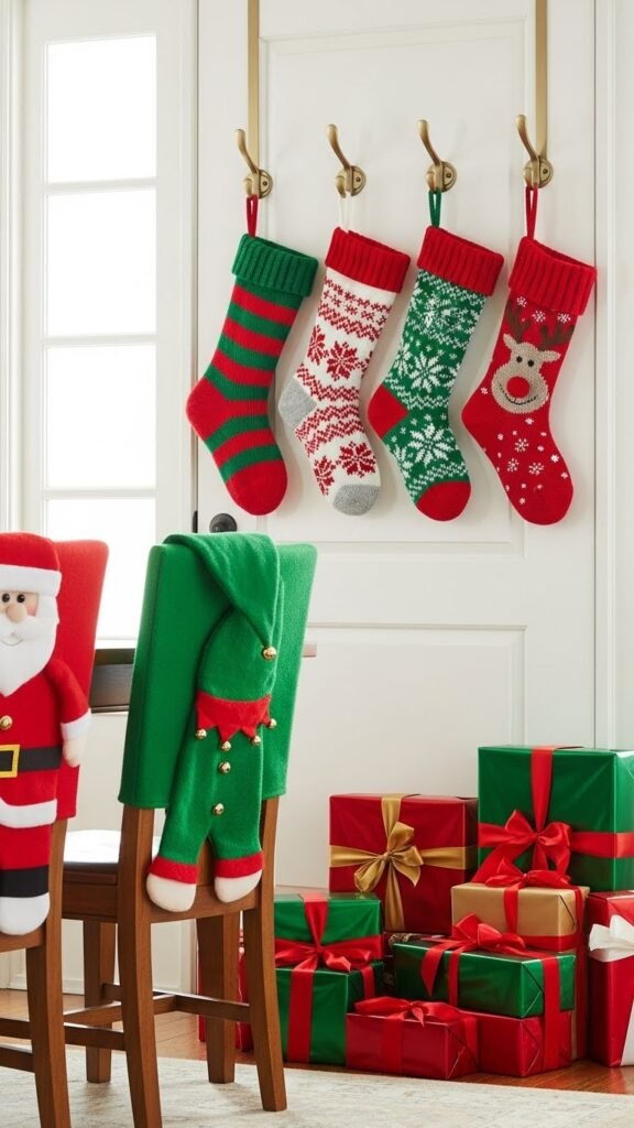 You’ll clip hook extensions for extra reach, drape stockings over chair backs, and secure fabric chair toppers to protect finishes. This portable solution keeps gifts accessible, looks intentional, and frees you from permanent fixtures while staying tidy and festive.