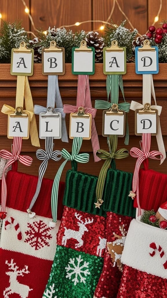 You’ll attach a small monogrammed clipboard tag to each clip for ID, then use ribbon loopers to tie through stocking loops. Choose sturdy clips, crisp fonts, and color-coded ribbons so each stocking reads cleanly and hangs reliably.