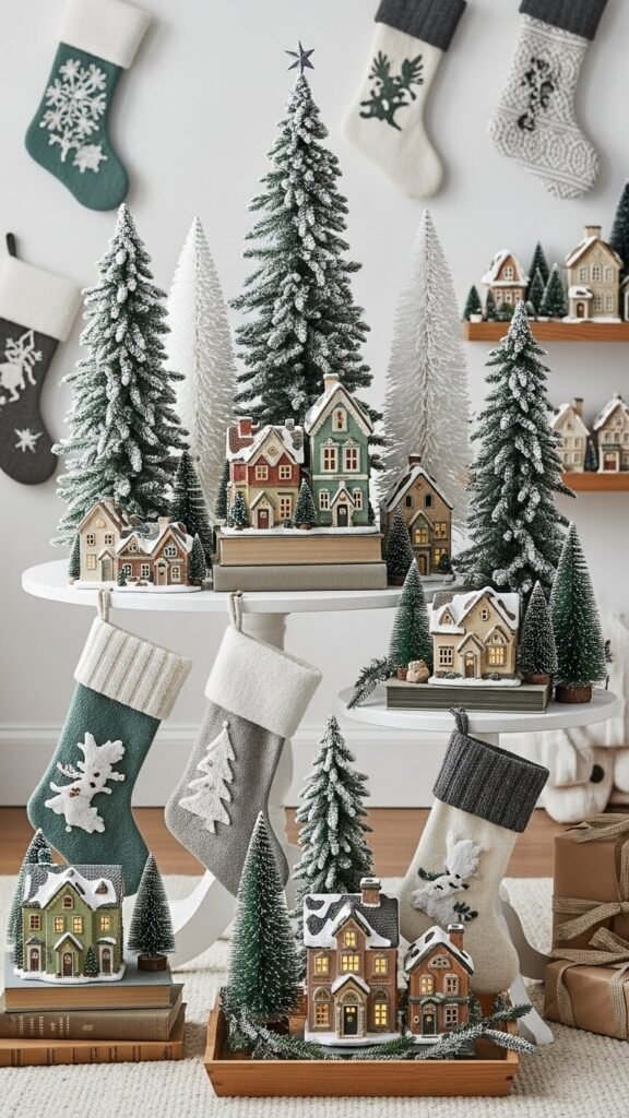 Layer small tabletop trees and miniature village houses around your stockings to create depth and a cozy, curated vignette. Place a miniature pine trio at varying heights, anchor houses on books or trays, and stagger distances for perspective. Use a snowy village palette—white, muted greens, warm wood—to keep the scene airy. Keep pathways clear so gifts remain accessible and the display feels liberating.