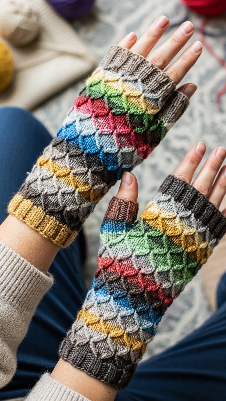 If you want a textured, mosaic-like effect that fits the hand snugly, entrelac is an ideal technique for fingerless gloves; it builds a fabric of interlocking diamonds that follow the contour of your wrist and hand.