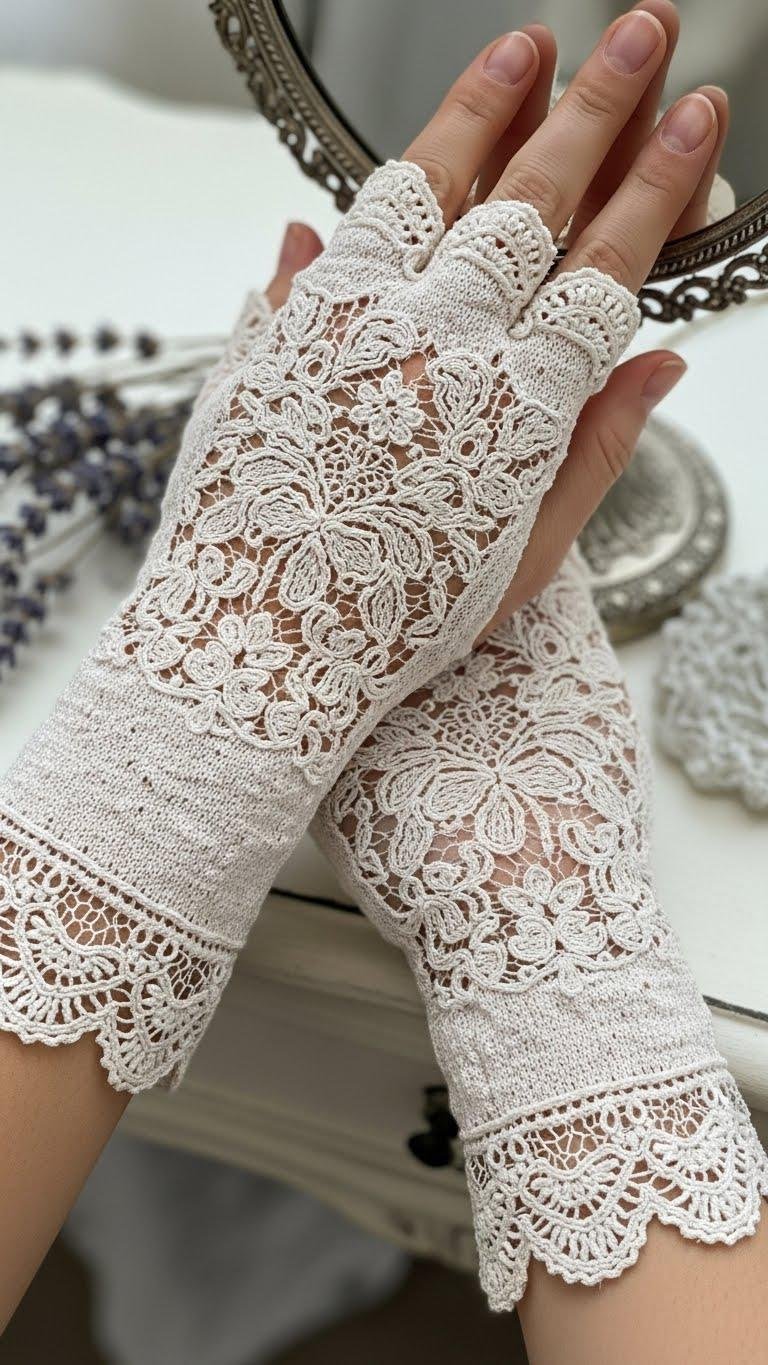 You’ll work lace motifs across the hand, add delicate edgings at wrist and fingers, and lean on vintage inspiration for repeatable charts.