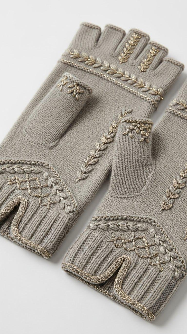 When you want to elevate a simple fingerless glove, add embroidered accents that follow the rib or stockinette lines and reinforce stress points like the thumb gusset and palm—small motifs, leaves, or geometric stitches bring visual interest without altering fit. You’ll pick precise embroidered motifs, plan placement over decreases, and echo color with subtle metallic threadwork for a refined, free-moving accessory.