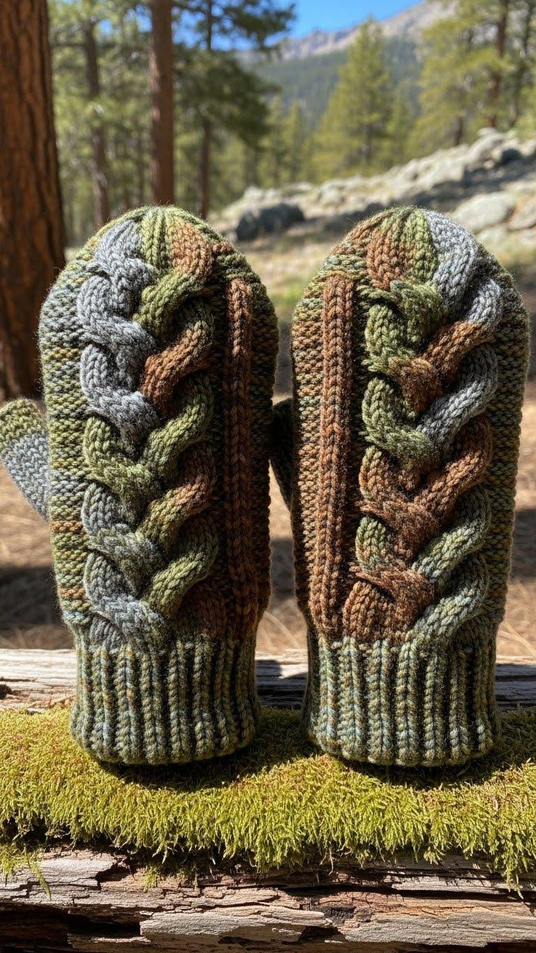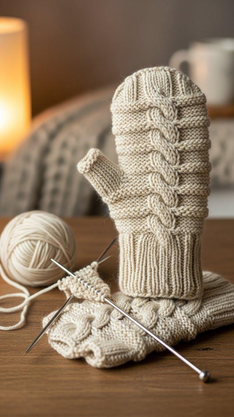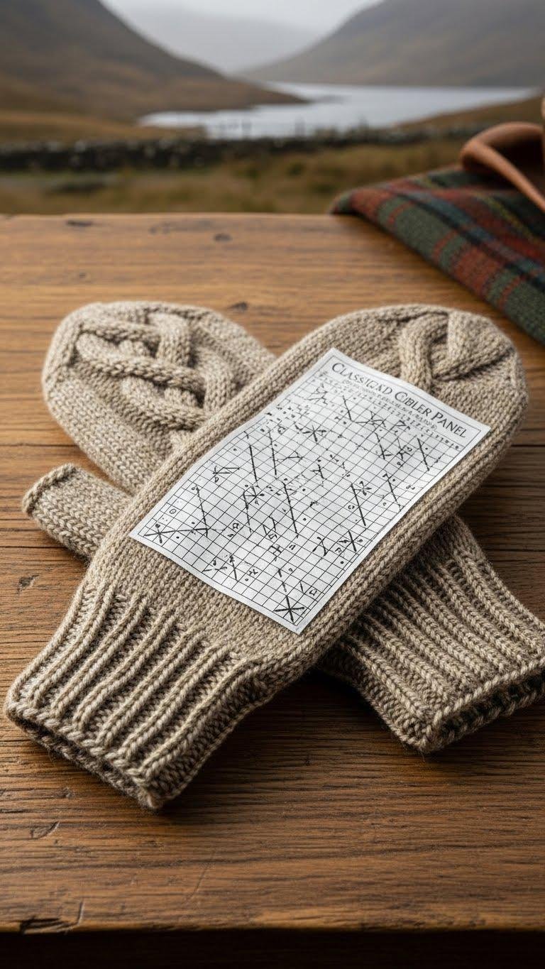 You’ll follow a concise charted cable panel, set thumb gusset, and sturdy ribbed cuff.