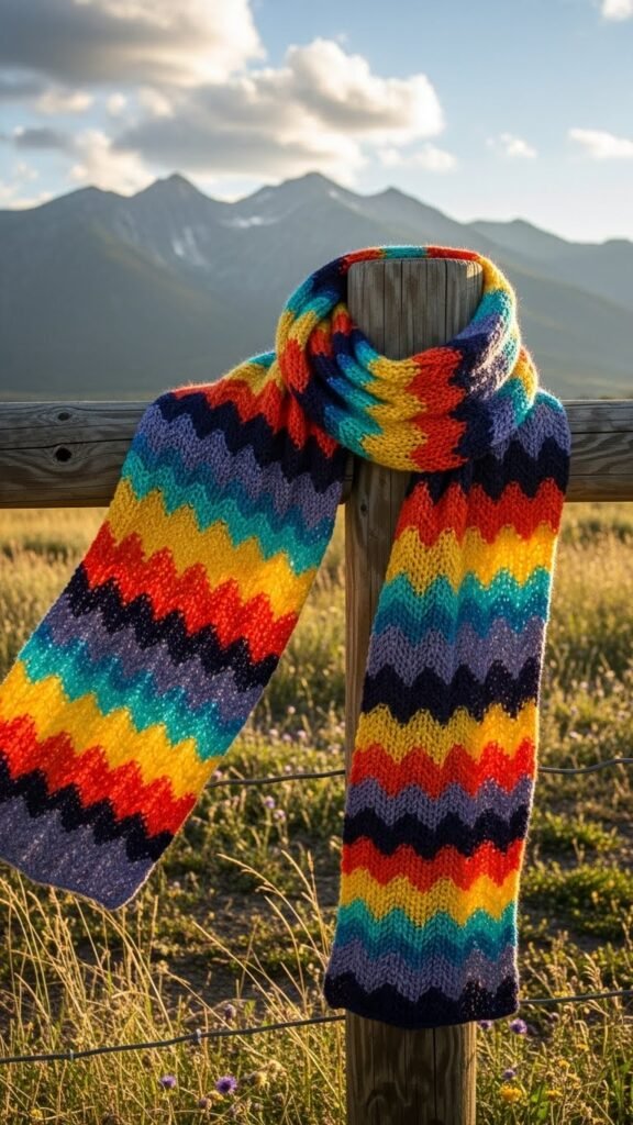 You’ll embrace textured chevrons and elongated ripples that drape freely, letting lightweight yarn and bold color play.