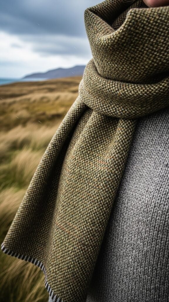 Think of a classic tweed blazer reimagined as a scarf: Harris Tweed style brings that same heritage weave and earthy palette to a cozy wrap you’ll reach for on blustery days.