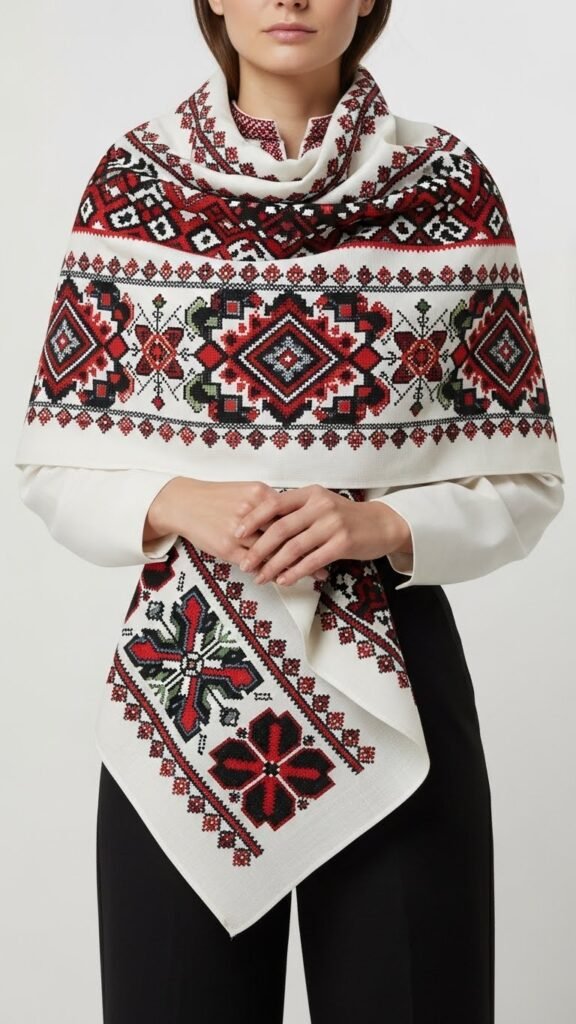 Bring heritage to your shoulders with a Vyshyvanka pattern scarf that pairs bold, geometric embroidery with contemporary silhouettes.