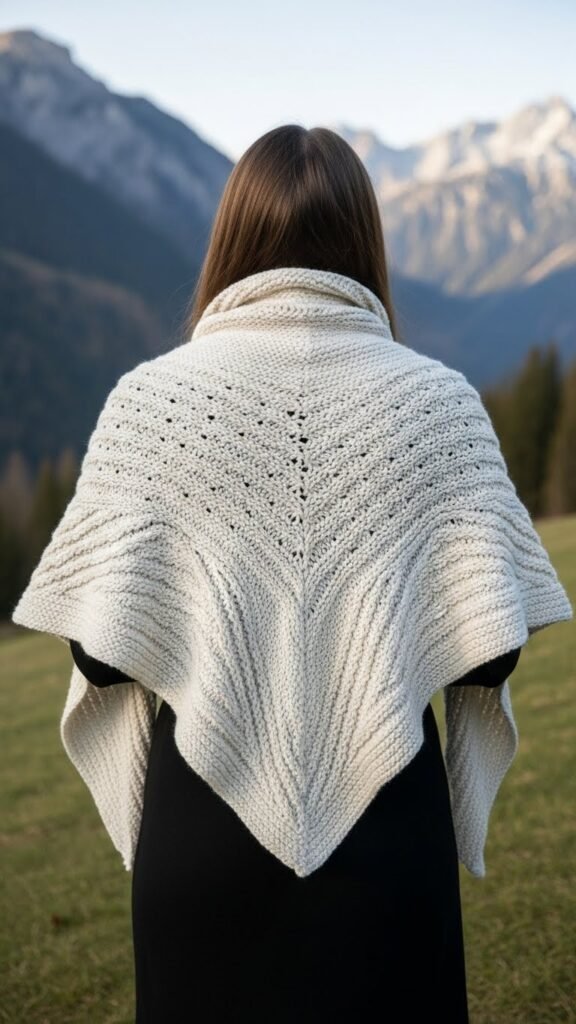 The Mountain Top Wrap lets you wear the crisp clarity of alpine air—a wide, triangular shawl worked in lofty stitches that layer like ridgelines across your shoulders.