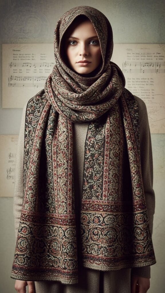 You’ll wear embroidered motifs that nod to folk symbolism while staying modern and minimal. Choose contrasting yarns, crisp repeats, and open textures so the scarf feels airy yet statement-making.