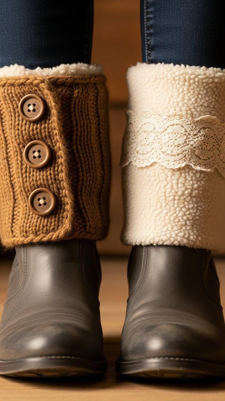Layer a pair of cozy boot cuffs over your shoes to add warmth, texture, and a touch of upcycled style without altering your boots. You can cut sweater cuffs, sew a slim tube, and add elastic for grip. Choose buttoned cuffs for adjustable flair or lace trimmed cuffs for feminine contrast.