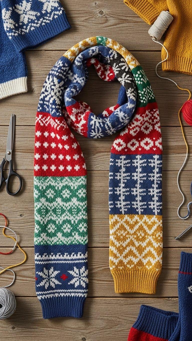 Gather up leftover sweater scraps and cut them into uniform strips or squares so you can stitch them into a vibrant patchwork scarf that’s warm, unique, and waste-free. You’ll arrange pieces like a colorful mosaic, pinning layouts until they sing.