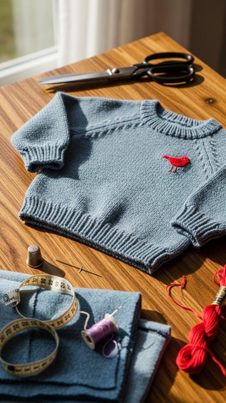 Shrink a grown-up sweater into a cozy child’s garment by trimming and reshaping it to fit smaller proportions—this saves fabric waste and keeps the sweater’s original texture and warmth.