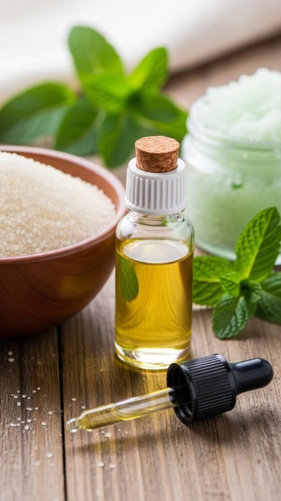 Start by gathering simple, skin-safe ingredients: fine granulated sugar, a moisturizing oil (like sweet almond or jojoba), and high-quality peppermint essential oil.