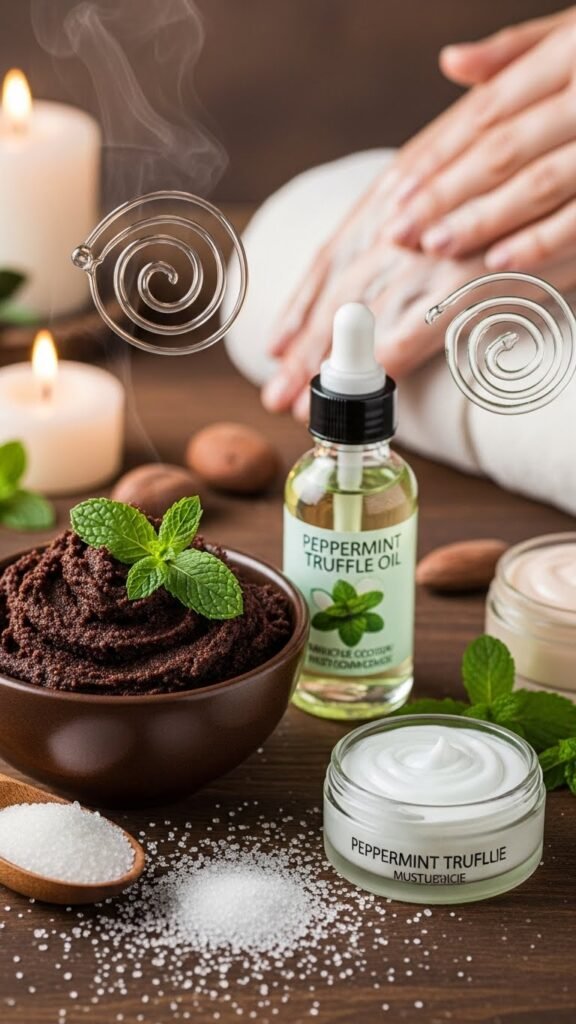You’ll blend fine sugar, peppermint truffle oil, and a lightweight carrier for glide. A gentle cocoa infusion adds antioxidants and velvety texture. Apply with circular motions, rinse thoroughly, and follow with a non-comedogenic moisturizer to lock in hydration and freedom of movement.