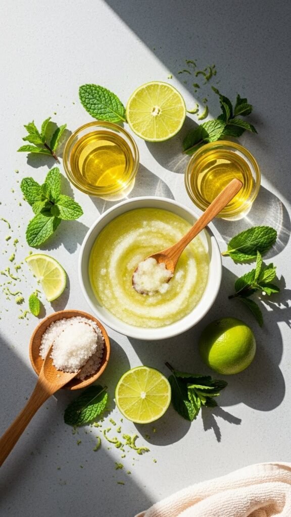 While the shea butter scrub restores and protects, the Lemon-Ginger Peppermint Revitalizing Scrub wakes and retextures skin with an uplifting, clarifying blend. You’ll mix sugar, peppermint oil, fresh lemon zest for a bright citrus infusion, and a touch of ginger zest for circulation. Apply gently, rinse thoroughly, and pat dry to reveal smoother, revived skin that feels liberated and balanced.