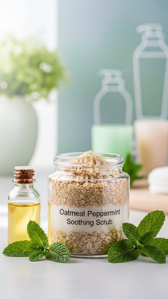 You’ll blend finely ground oats with sugar, a light carrier oil, and a few drops of peppermint for gentle exfoliation and a cooling, calming aroma. Apply lightly, rinse, and pat dry to reveal soothed, flexible skin.
