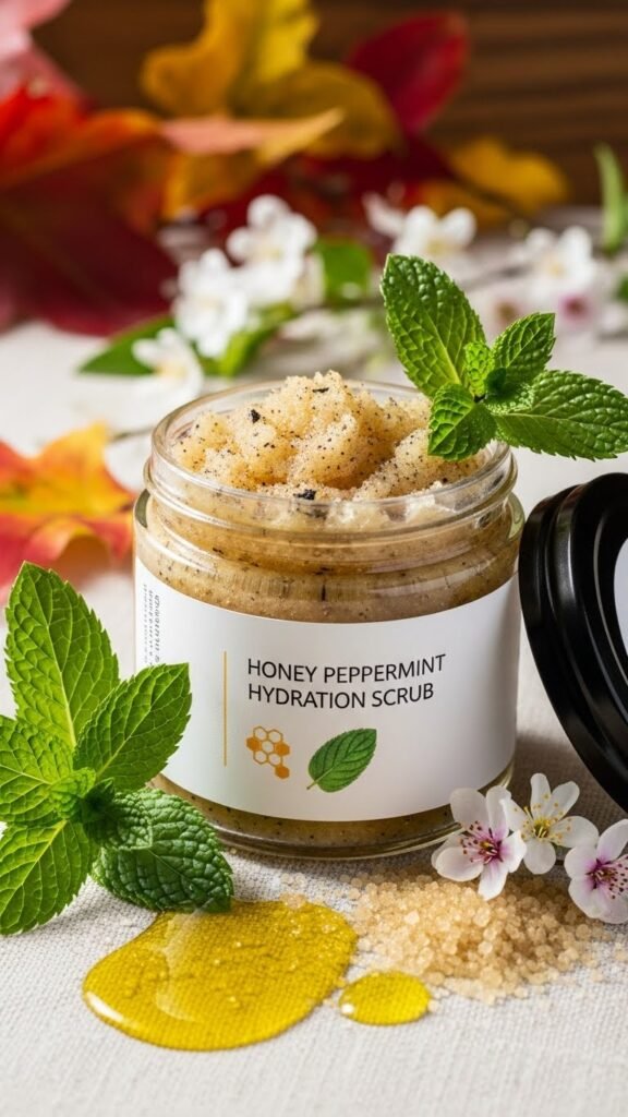Combine the humectant power of honey with cooling peppermint to create a hydration-focused scrub that replenishes moisture while gently exfoliating. You’ll blend fine sugar, jojoba oil, and a few drops of peppermint essential oil for revitalizing skin relief. Consider seasonal scent pairings to vary aroma and prioritize packaging sustainability when you jar your scrub, so your ritual stays effective and eco-responsible.
