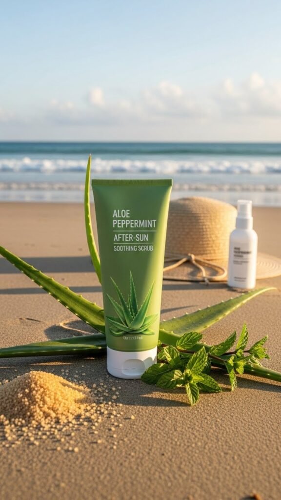 Because sun-exposed skin needs calming hydration as much as gentle exfoliation, the Aloe Peppermint After-Sun Soothing Scrub combines cooling aloe vera with mild peppermint and finely ground sugar to reduce heat, remove flaky cells, and prep skin for repair.