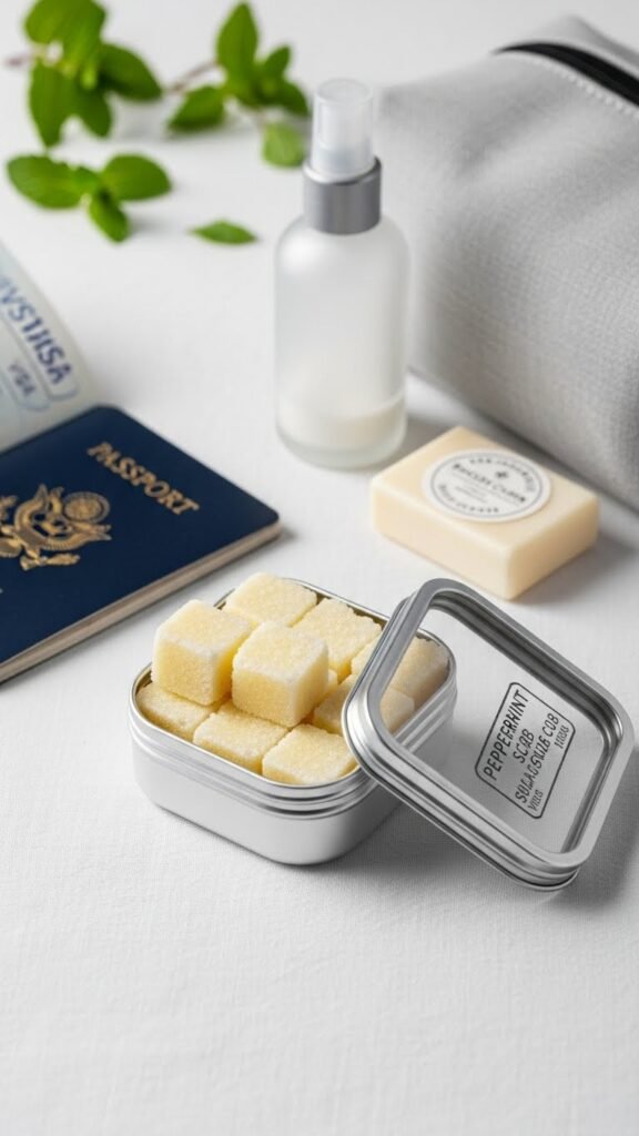 Pack these peppermint sugar scrub cubes for travel to keep skin smooth and fresh on the go. You’ll portion cubes into airtight tins for tidy storage and minimal mess. Use TSA friendly portions to comply with security while preserving potency.
