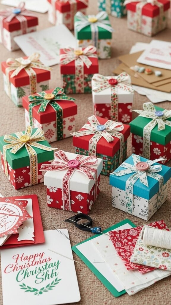 Gather a small stack of sturdy holiday cards, some lightweight cardboard or recycled cereal boxes, a needle, strong thread or thin twine, and fabric scraps—you’ll turn these materials into compact, sewn decorative boxes that hold jewelry, gift cards, or tiny treats. Cut panels, stitch edges, line with fabric scraps, and finish with ribbon bows and button accents. These mini boxes feel intentional and free.